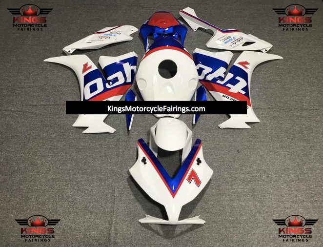 Previous Product Next ProductWhite, Blue and Red Tyco 7 Fairing Kit for a 2012, 2013, 2014, 2015 & 2016 Honda CBR1000RR motorcycle.