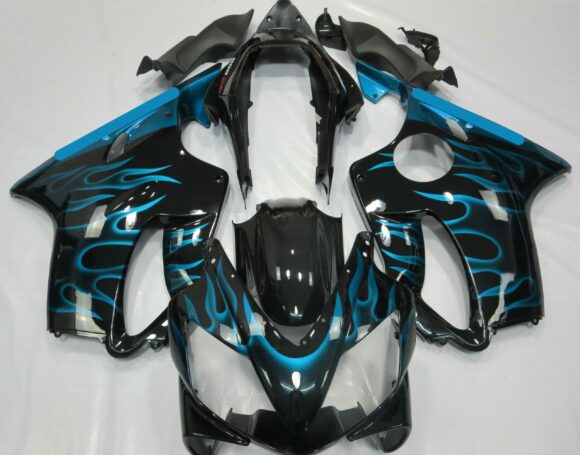 Previous Product Next ProductBlack and Light Blue Flames Fairing Kit for a 2001, 2002, 2003 Honda CBR600F4i motorcycle.