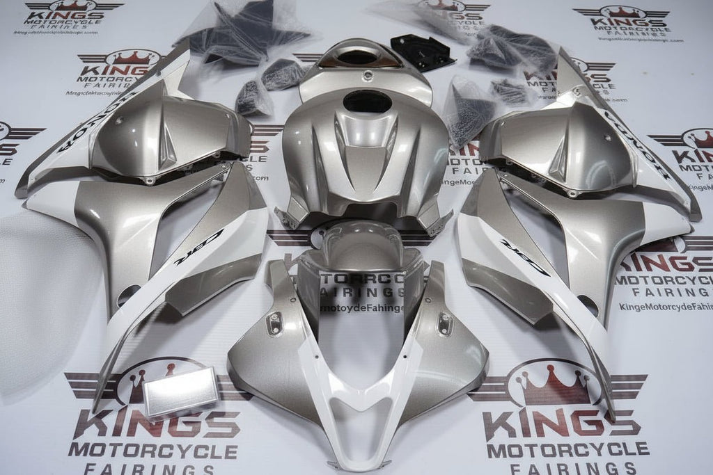 Previous Product Next ProductSilver, White Stripe, Black Fairing Kit for a 2009, 2010, 2011, 2012 Honda CBR600RR motorcycle.