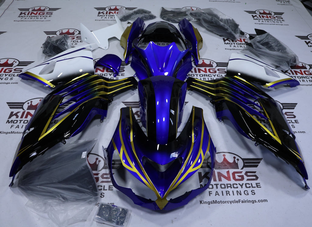 Previous Product Next ProductBlue, Black, Gold, White Fairing Kit for a 2012, 2013, 2014, 2015, 2016, 2017, 2018, 2019, 2020, 2021, 2022, 2023, 2024 Kawasaki Ninja ZX14R motorcycle.