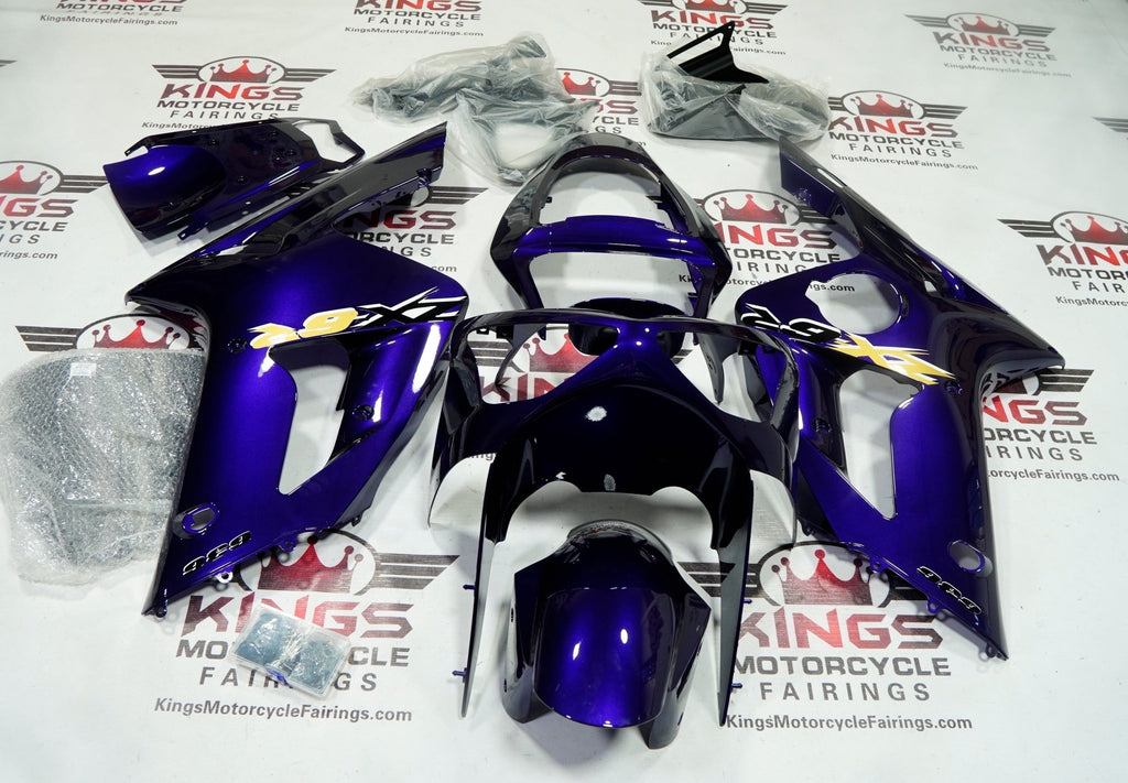 Previous Product Next ProductPurple, Black, Yellow Fairing Kit for a 2003, 2004 Kawasaki ZX6R 636 motorcycle.