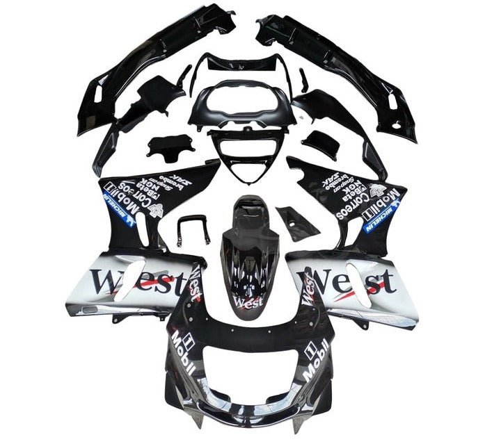 Previous Product Next ProductBlack, White West Fairing Kit for a 1993, 1994, 1995, 1996, 1997, 1998, 1999, 2000, 2001, 2002, 2003, 2004, 2005, 2006, 2007 Kawasaki ZZR400 motorcycle.