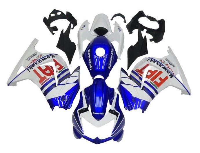 Previous Product Next ProductBlue, White, Red FIAT Fairing Kit for a 2008, 2009, 2010, 2011, 2012, 2013 Kawasaki Ninja 250R motorcycle.