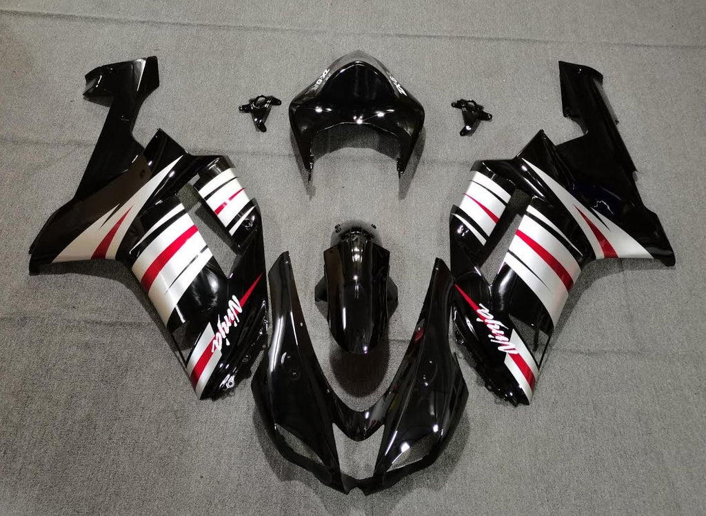 Previous Product Next ProductBlack, Silver and Red Fairing Kit for a 2007 & 2008 Kawasaki Ninja ZX-6R 636 motorcycle.