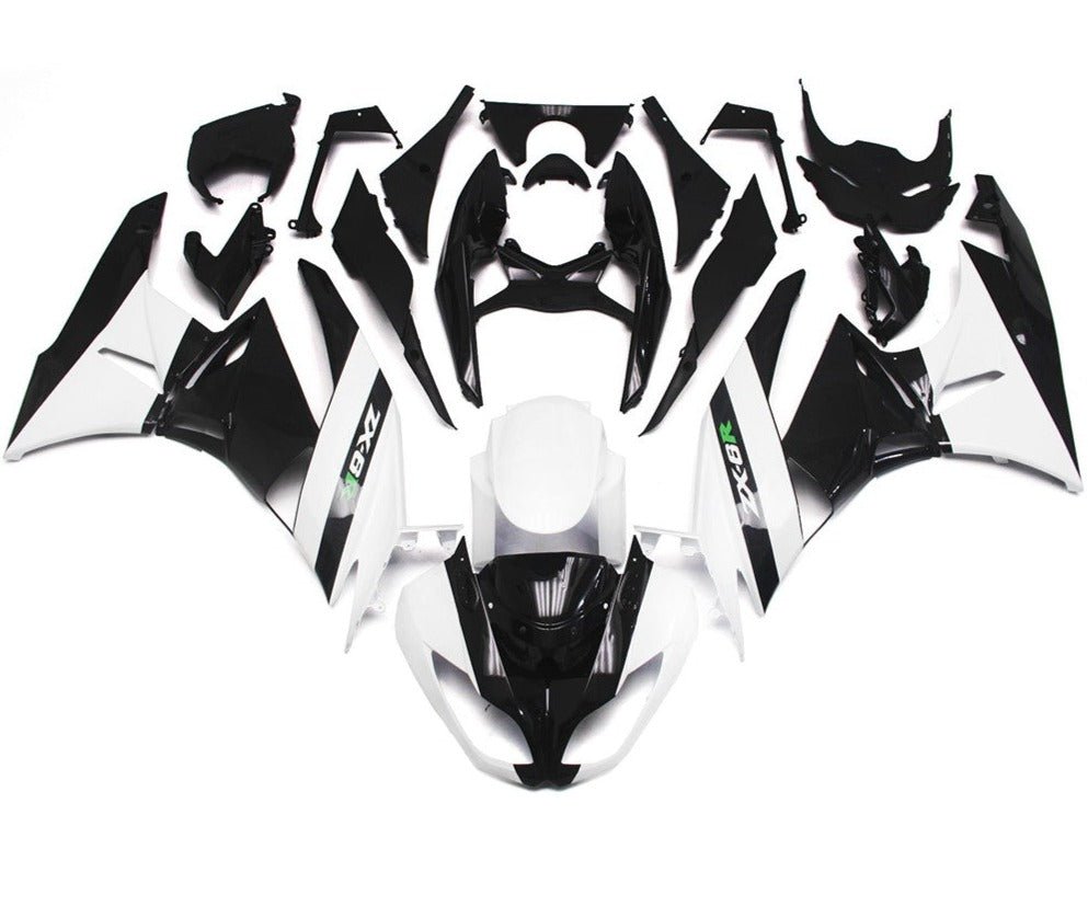 Previous Product Next ProductWhite and Black Fairing Kit for a 2009, 2010, 2011 & 2012 Kawasaki Ninja ZX-6R 636 motorcycle.