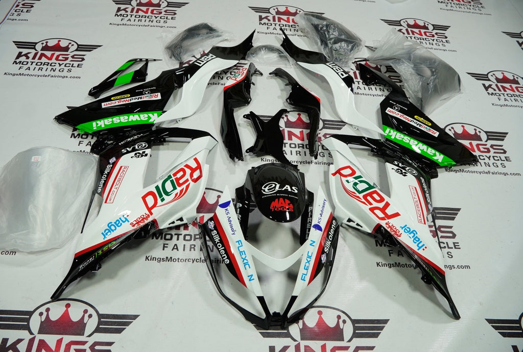 Black, White and Red Rapid Fairing Kit for a 2013, 2014, 2015, 2016, 2017 & 2018 Kawasaki ZX-6R 636 motorcycle.