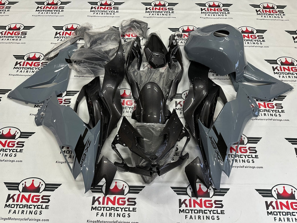 Previous Product Next ProductGray, Faux Carbon Fiber, Black Fairing Kit for a 2019, 2020, 2021, 2022, 2023 Kawasaki Ninja ZX-6R 636 motorcycle.