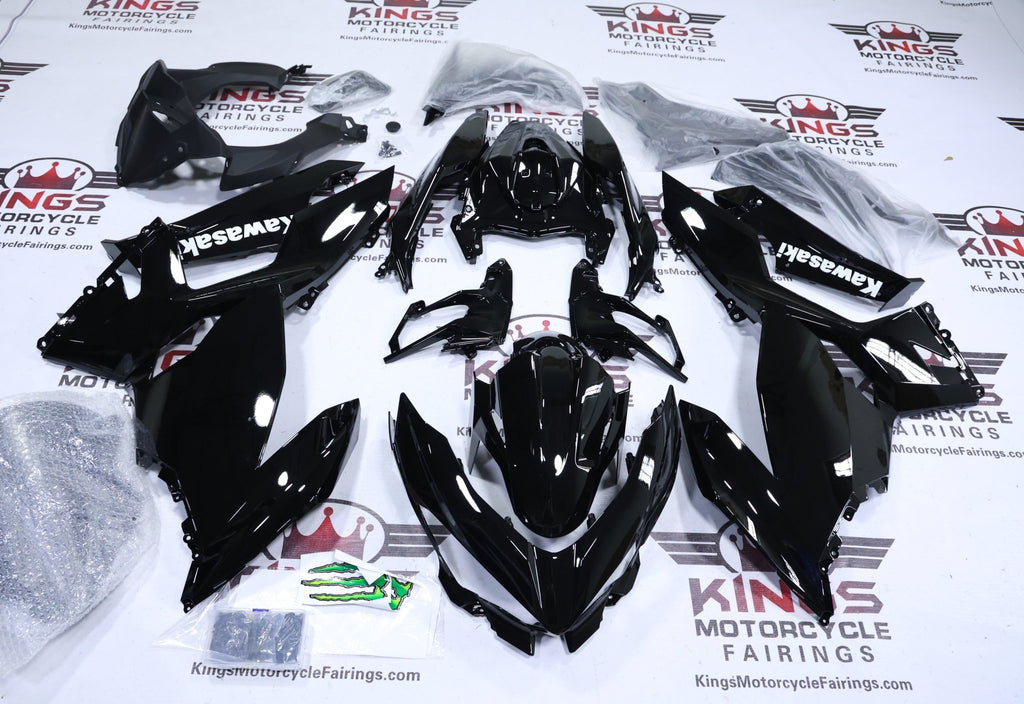 Previous Product Next ProductBlack Gloss, White Fairing Kit for a 2018, 2019, 2020, 2021, 2022, 2023 Kawasaki Ninja 400 motorcycle.