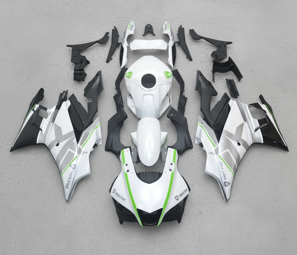 Previous Product Next ProductWhite, Silver, Green Fairing Kit for a Yamaha YZF-R3 2022, 2023, 2024 motorcycle.