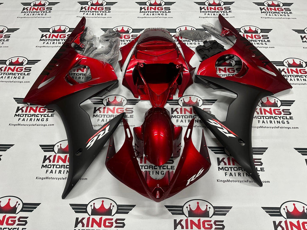 Previous Product Next ProductDark Red and Matte Black Fairing Kit for a 2005 Yamaha YZF-R6 motorcycle.