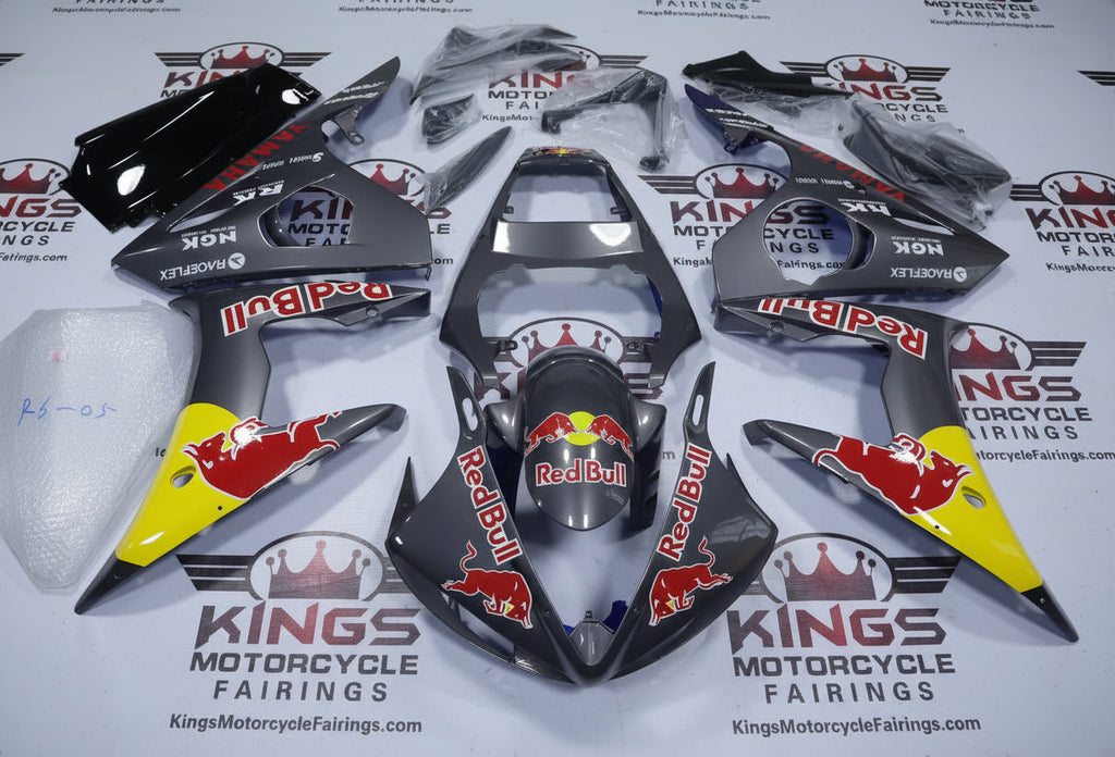 Previous Product Next ProductGray, Yellow, Red Bull Fairing Kit for a 2005 Yamaha R6 motorcycle.