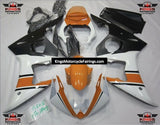 Previous Product Next ProductWhite, Orange and Matte Black Fairing Kit for a 2005 Yamaha YZF-R6 motorcycle.
