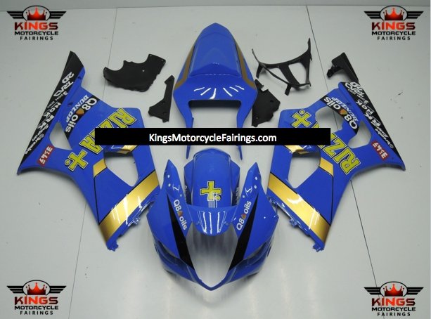 Previous Product Next ProductBlue and Gold Rizla Fairing Kit for a 2003 & 2004 Suzuki GSX-R1000 motorcycle.