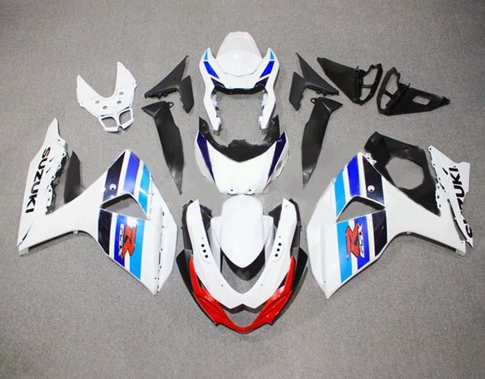 Previous Product Next ProductWhite, Triple Blue Stripe Fairing Kit for a 2009, 2010, 2011, 2012, 2013, 2014, 2015 & 2016 Suzuki GSX-R1000 motorcycle.