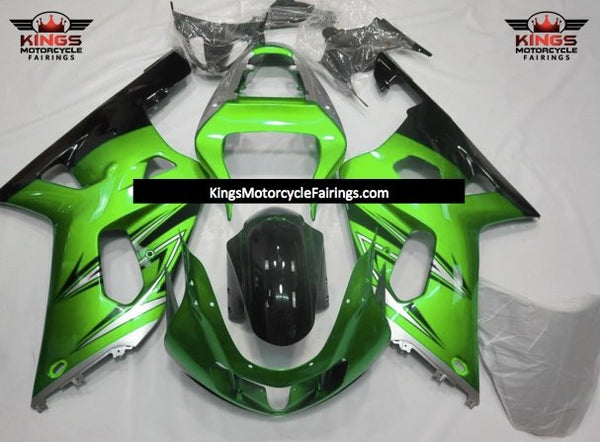 Previous Product Next ProductGreen, Silver and Black Fairing Kit for a 2000, 2001, 2002 & 2003 Suzuki GSX-R600 motorcycle.