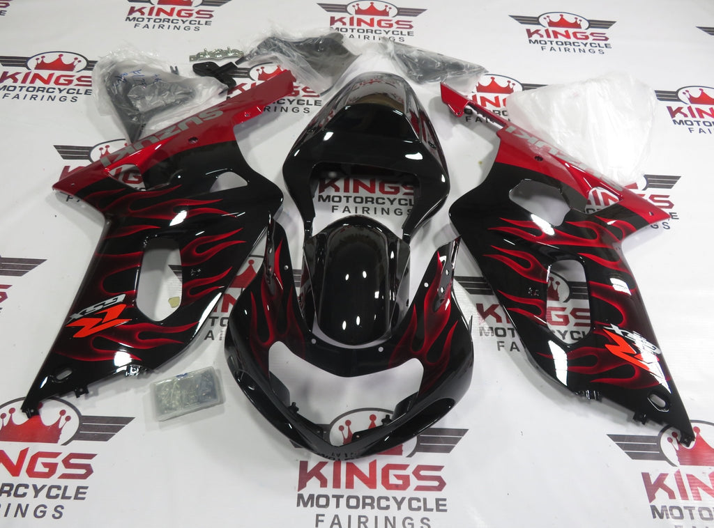 Previous Product Next ProductBlack and Candy Apple Red Flame Fairing Kit for a 2000, 2001, 2002, 2003 Suzuki GSXR750 motorcycle.