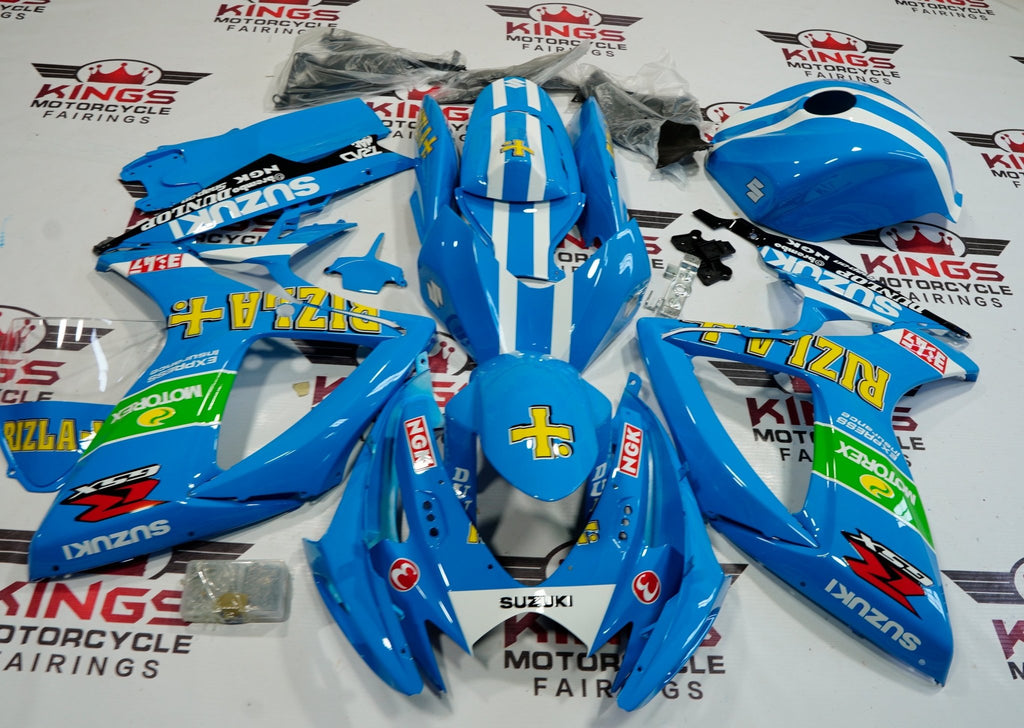 Previous Product Next ProductLight Blue and White Rizla Fairing Kit for a 2006 & 2007 Suzuki GSX-R750 motorcycle.