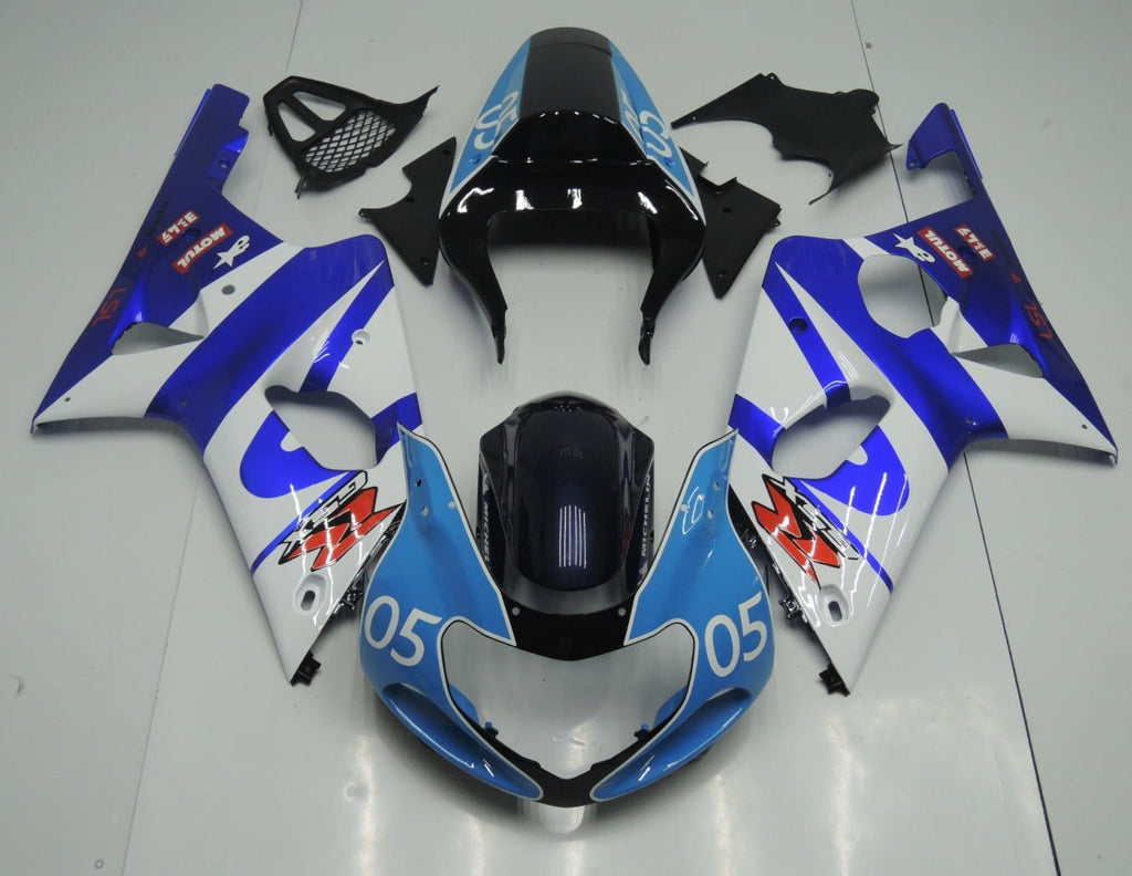 Previous Product Next ProductWhite, Blue, Black and Light Blue #05 Fairing Kit for a 2000, 2001 & 2002 Suzuki GSX-R1000 motorcycle.