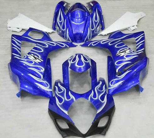 Previous Product Next ProductBlue and White Flame Fairing Kit for a 2007 & 2008 Suzuki GSX-R1000 motorcycle.