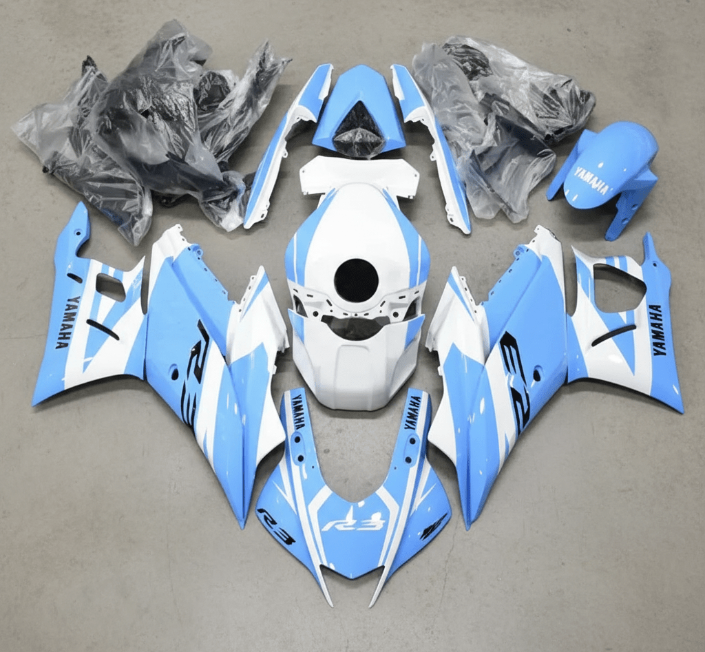 Previous Product Next ProductLight Blue, White Fairing Kit for a Yamaha YZF-R3 2022, 2023, 2024 motorcycle.