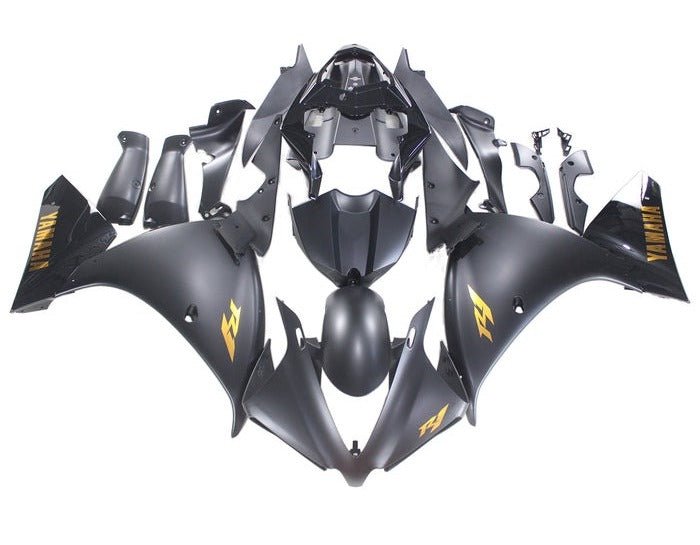 Previous Product Next ProductMatte Black, Gold, Gloss Black Fairing Kit for a 2009, 2010 & 2011 Yamaha YZF-R1 motorcycle.