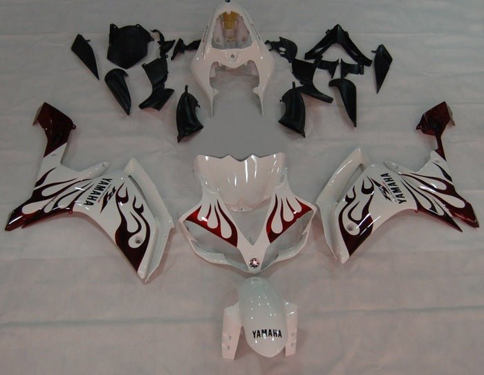 Previous Product Next ProductWhite, Dark Red Fire Fairing Kit for a 2007 & 2008 Yamaha YZF-R1 motorcycle.