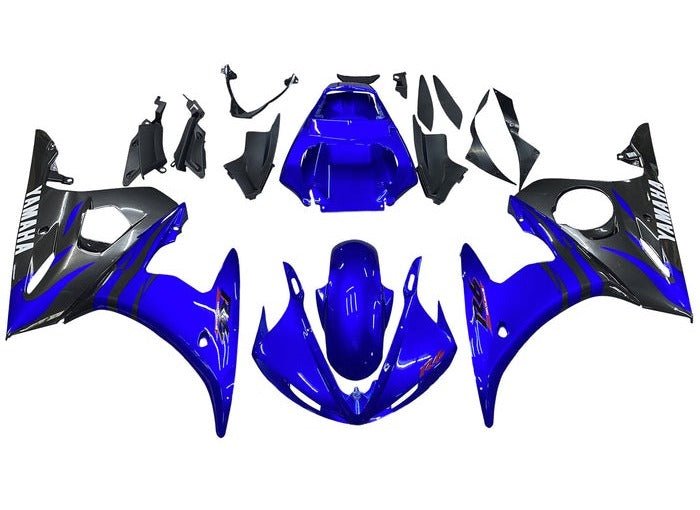 Previous Product Next ProductBlue, Black Flames Fairing Kit for a 2003 & 2004 Yamaha YZF-R6 motorcycle.
