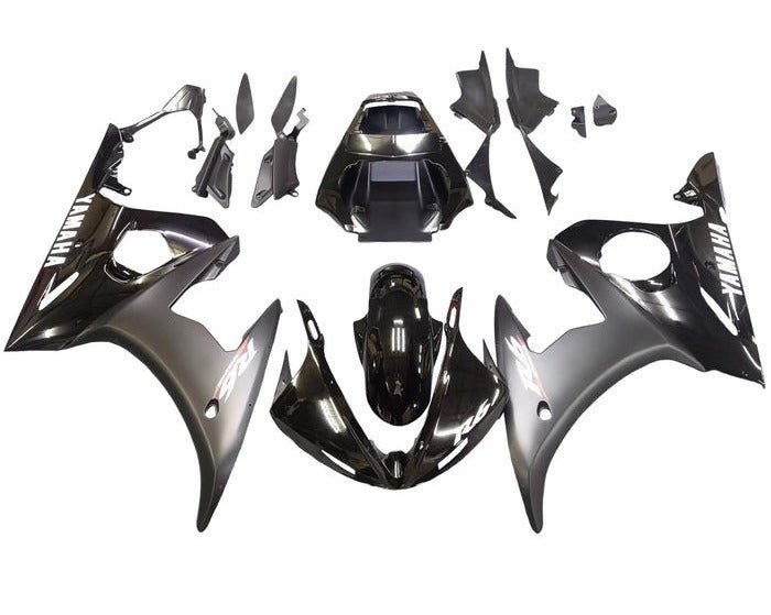 Previous Product Next ProductBlack, Matte Black, White Fairing Kit for a 2005 Yamaha YZF-R6 motorcycle.
