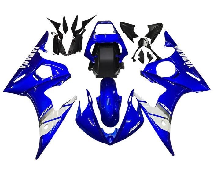 Previous Product Next ProductBlue, White, Silver Stripe Fairing Kit for a 2005 Yamaha YZF-R6 motorcycle.