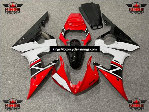 Previous Product Next ProductRed, White and Black Fairing Kit for a 2005 Yamaha YZF-R6 motorcycle.