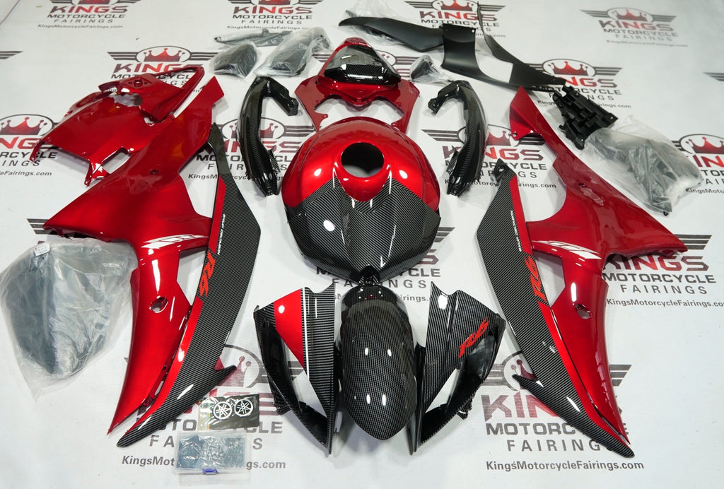 Previous Product Next ProductDark Red, Faux Carbon Fiber Fairing Kit for a 2008, 2009, 2010, 2011, 2012, 2013, 2014, 2015, 2016 Yamaha YZF-R6 motorcycle.