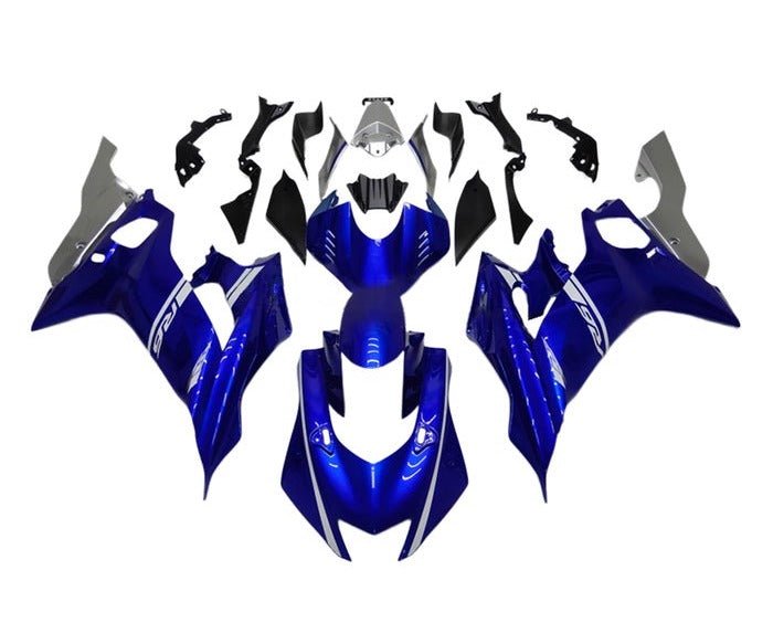 Previous Product Next ProductBlue, Silver, White Stripe Fairing Kit for a 2017, 2018, 2019, 2020, 2021, 2022 Yamaha YZF-R6 motorcycle.