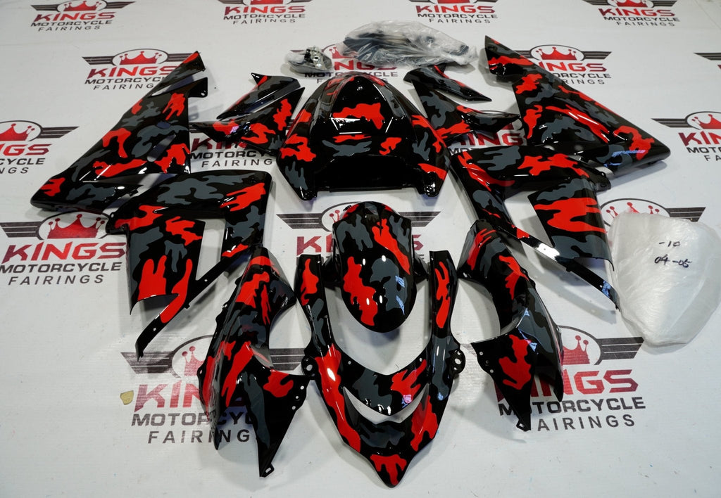 Black, Gray and Red Camouflage Fairing Kit for a 2004 & 2005 Kawasaki ZX-10R motorcycle.