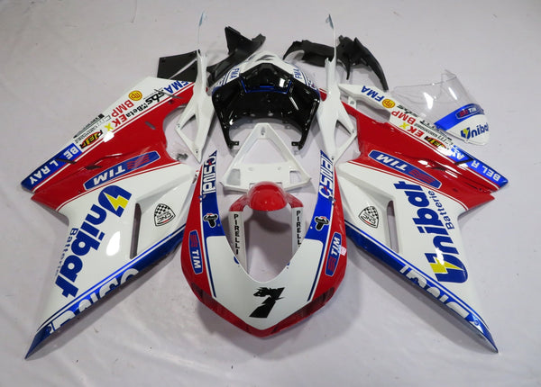 White, Red and Blue Unibat Fairing Kit for a 2007, 2008, 2009, 2010, 2011, 2012, 2013 & 2014 Ducati 848 motorcycle.