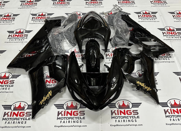 Black, Gold Fairing Kit for a 2005, 2006 Kawasaki Ninja ZX6R 636 motorcycle.