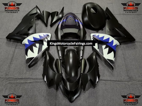 Fairing kit for a Kawasaki ZX10R (2004-2005) Matte Black, Blue & White Shark Teeth
