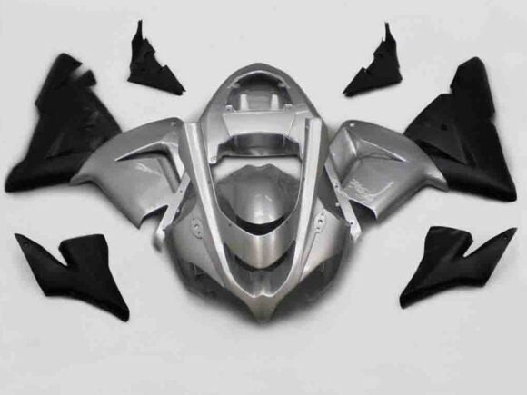 Silver and Matte Black Fairing Kit for a 2004 & 2005 Kawasaki ZX-10R motorcycle.