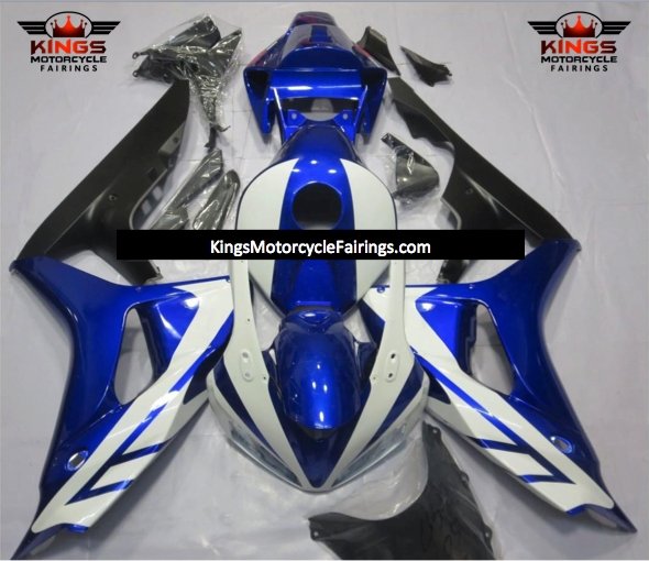 White, Blue and Matte Black Fairing Kit for a 2006 & 2007 Honda CBR1000RR motorcycle.