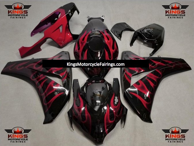 Black and Red Flame Fairing Kit for a 2008, 2009, 2010 & 2011 Honda CBR1000RR motorcycle.