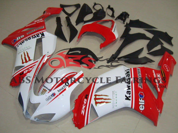 White and Red Monster Energy Fairing Kit for a 2007 & 2008 Kawasaki Ninja ZX-6R 636 motorcycle.