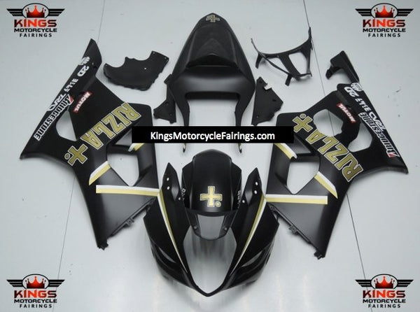 Matte Black and Gold Rizla Fairing Kit for a 2003 & 2004 Suzuki GSX-R1000 motorcycle.