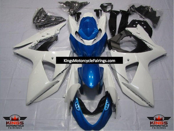 White and Blue Fairing Kit for a 2009, 2010, 2011, 2012, 2013, 2014, 2015 & 2016 Suzuki GSX-R1000 motorcycle.