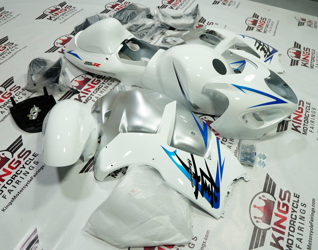 White, Blue and Silver Fairing Kit for a 1999, 2000, 2001, 2002, 2003, 2004, 2005, 2006, & 2007 Suzuki GSX-R1300 Hayabusa motorcycle.