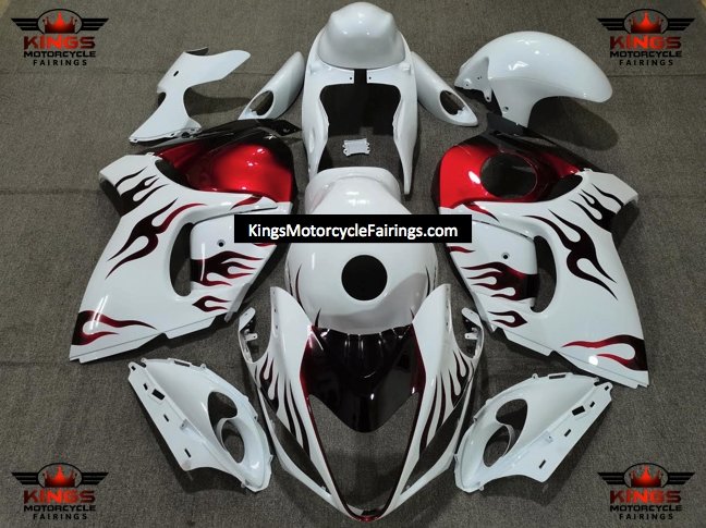White and Red Flame Fairing Kit for a 2008, 2009, 2010, 2011, 2012, 2013, 2014, 2015, 2016, 2017, 2018 & 2019 Suzuki GSX-R1300 Hayabusa motorcycle.