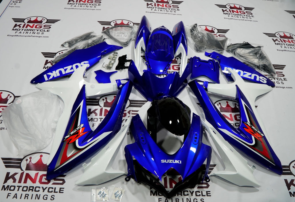 Blue, White, Black, Gray and Red Fairing Kit for a 2008, 2009, & 2010 Suzuki GSX-R600 motorcycle.