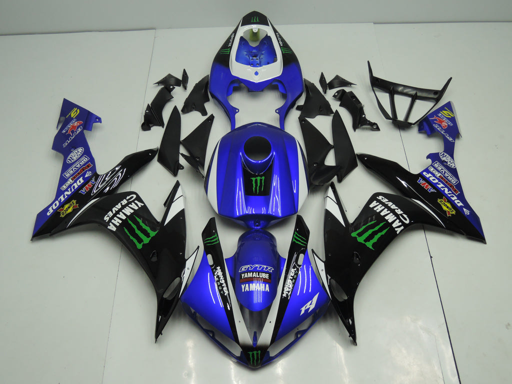 Blue, Black and White Monster Energy Fairing Kit for a 2004, 2005 & 2006 Yamaha YZF-R1 motorcycle.
