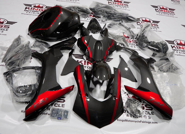 Faux Carbon Fiber and Red Stripe Fairing Kit for a 2015, 2016, 2017, 2018, 2019 Yamaha YZF-R1 motorcycle.