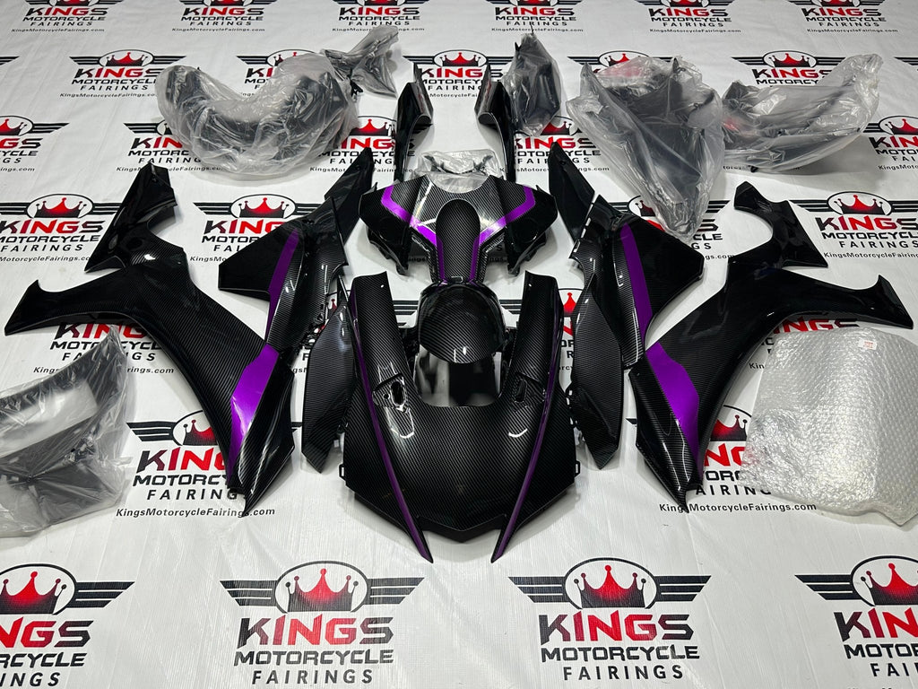 Faux Carbon Fiber, Purple Striped Fairing Kit for a 2020, 2021, 2022, 2024, 2025 Yamaha R1 motorcycle.