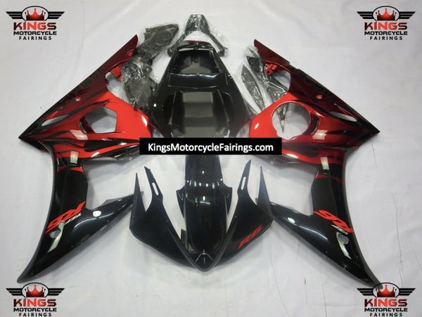 Black and Red Flame Fairing Kit for a 2005 Yamaha YZF-R6 motorcycle.
